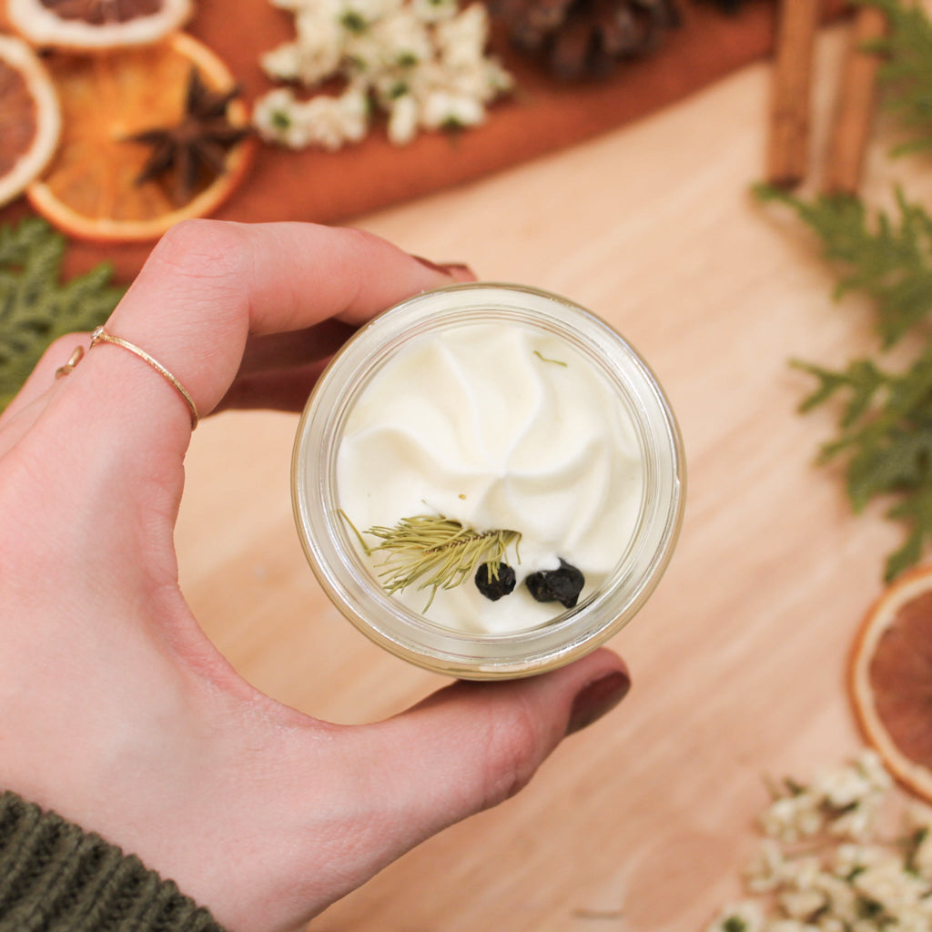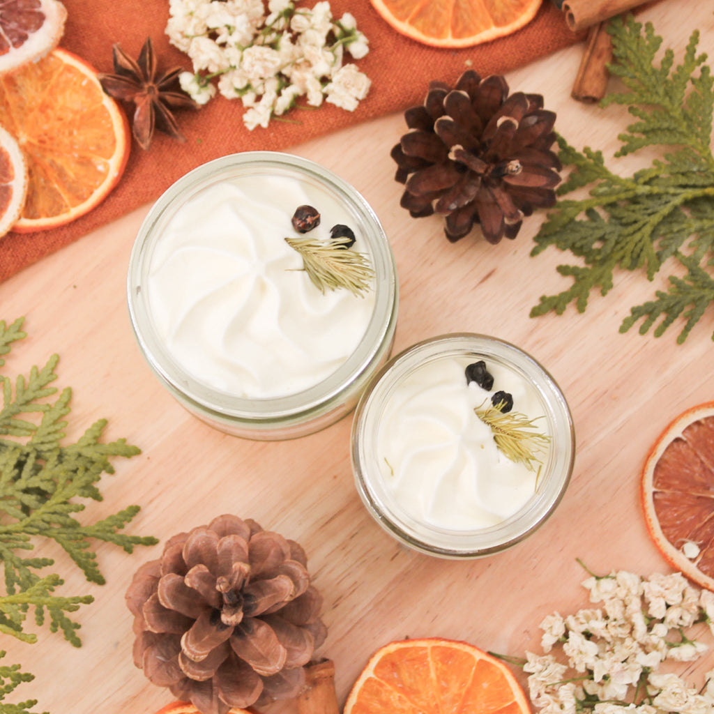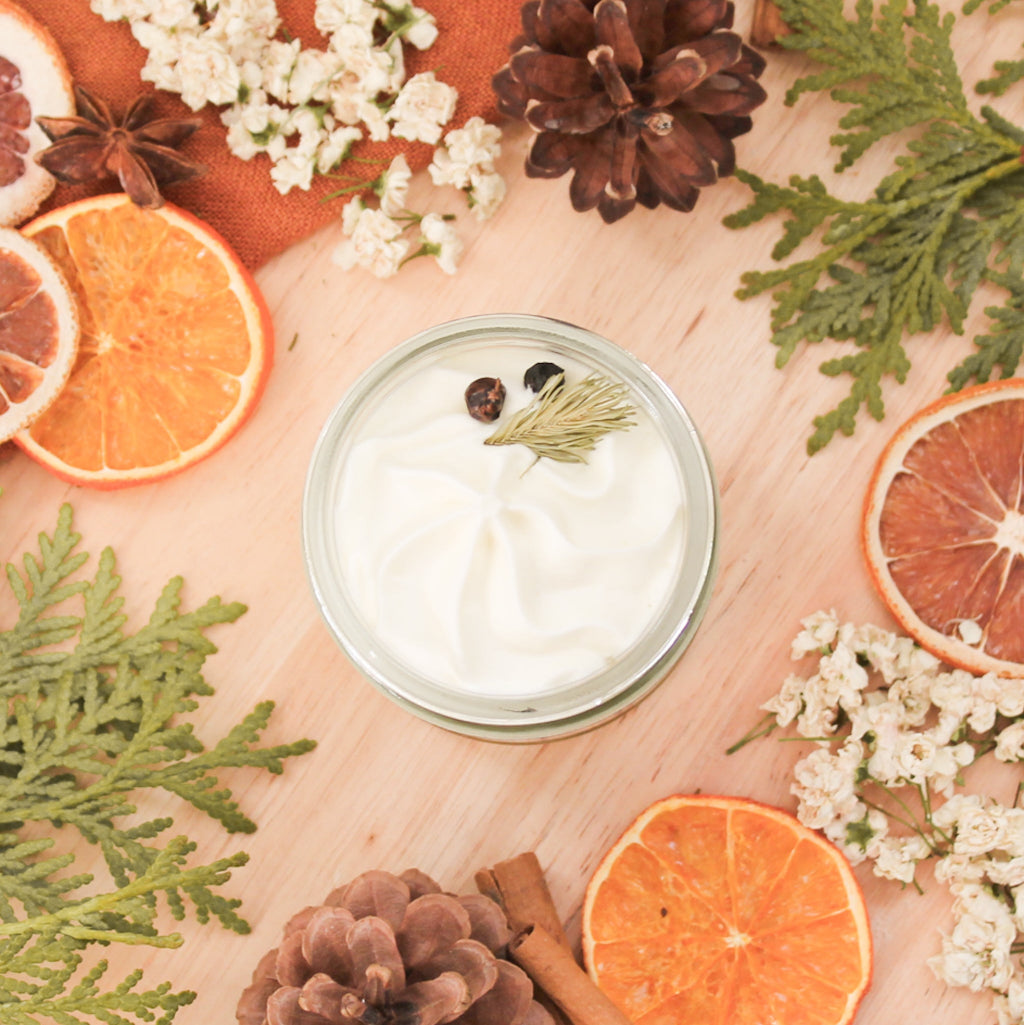 Le beurre fouetté eucalyptus et sapin dégage un parfum rafraîchissant, où se mélangent les arômes frais et boisés de l'eucalyptus et les notes forestières et résineuses du sapin baumier. Grâce à ces huiles essentielles, l'odeur rappelle l’air pur d’une forêt de conifères balayée par une brise hivernale.