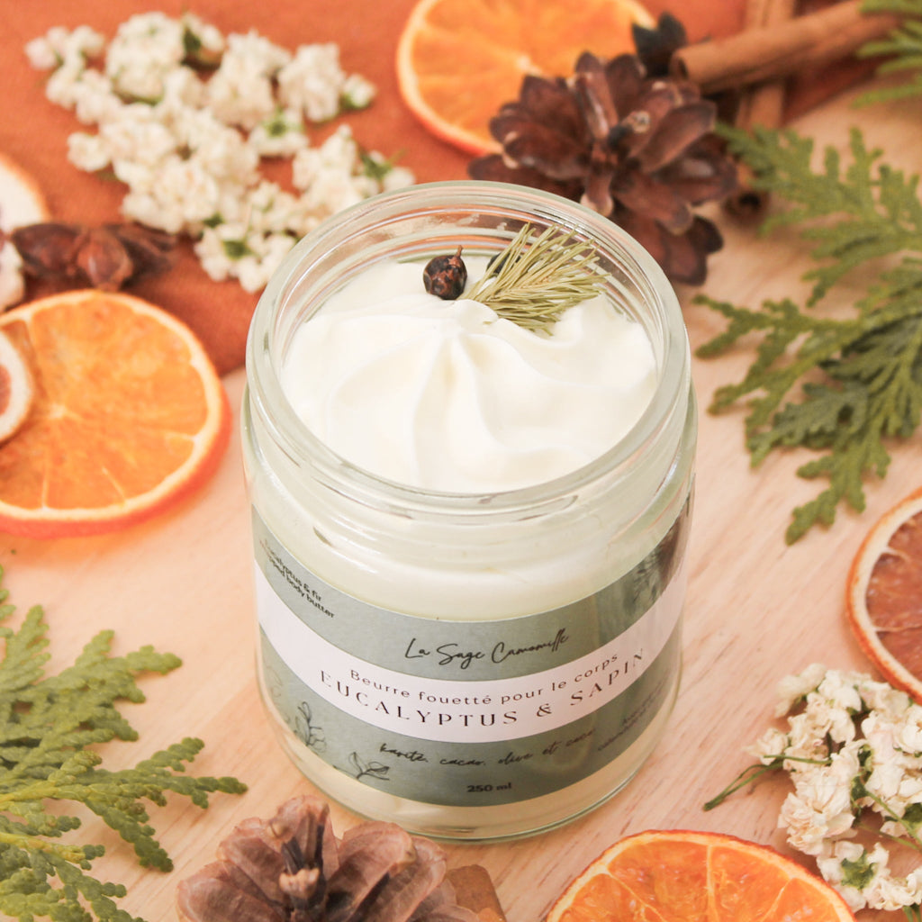 Grâce au riche mélange de beurres et d'huiles, la texture légère du beurre fouetté sur la peau hydrate celle-ci en profondeur tout en la rendant douce au toucher. Fabriqué avec des extraits de fleurs de calendule et de camomille qui ont été récoltées avec soin, le beurre aide à apaiser tous types de peau. Les huiles essentielles d’eucalyptus et de sapin, quant à elles, contribuent à nettoyer la peau en profondeur et à calmer lors d'irritations.