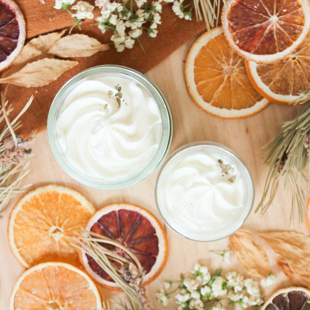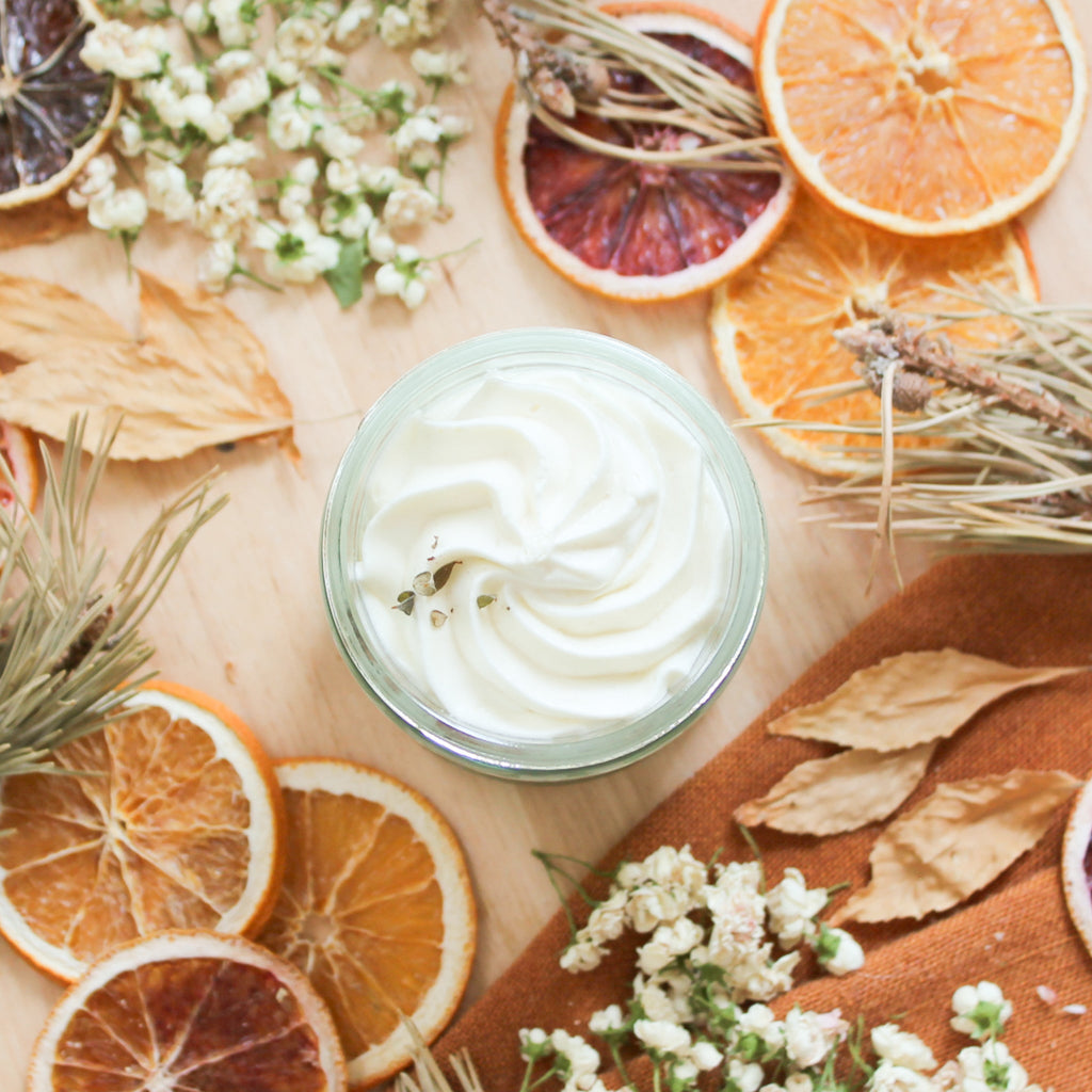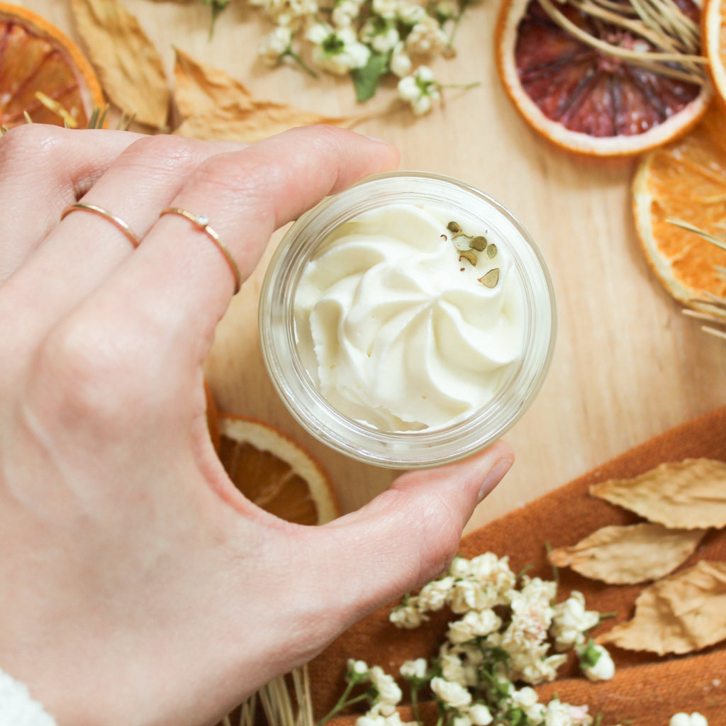 Grâce au riche mélange de beurres et d'huiles, la texture légère du beurre fouetté sur la peau hydrate celle-ci en profondeur tout en la rendant douce au toucher. Fabriqué avec des extraits de fleurs de calendule et de camomille qui ont été récoltées avec soin, le beurre aide à apaiser tous types de peau. Les huiles essentielles d’eucalyptus et de menthe poivrée, quant à elles, sont reconnues pour leurs propriétés purifiantes, apaisantes et rafraîchissantes. Elles aident à calmer les irritations de la peau et laissent une sensation propre et fraîche sur celle-ci.