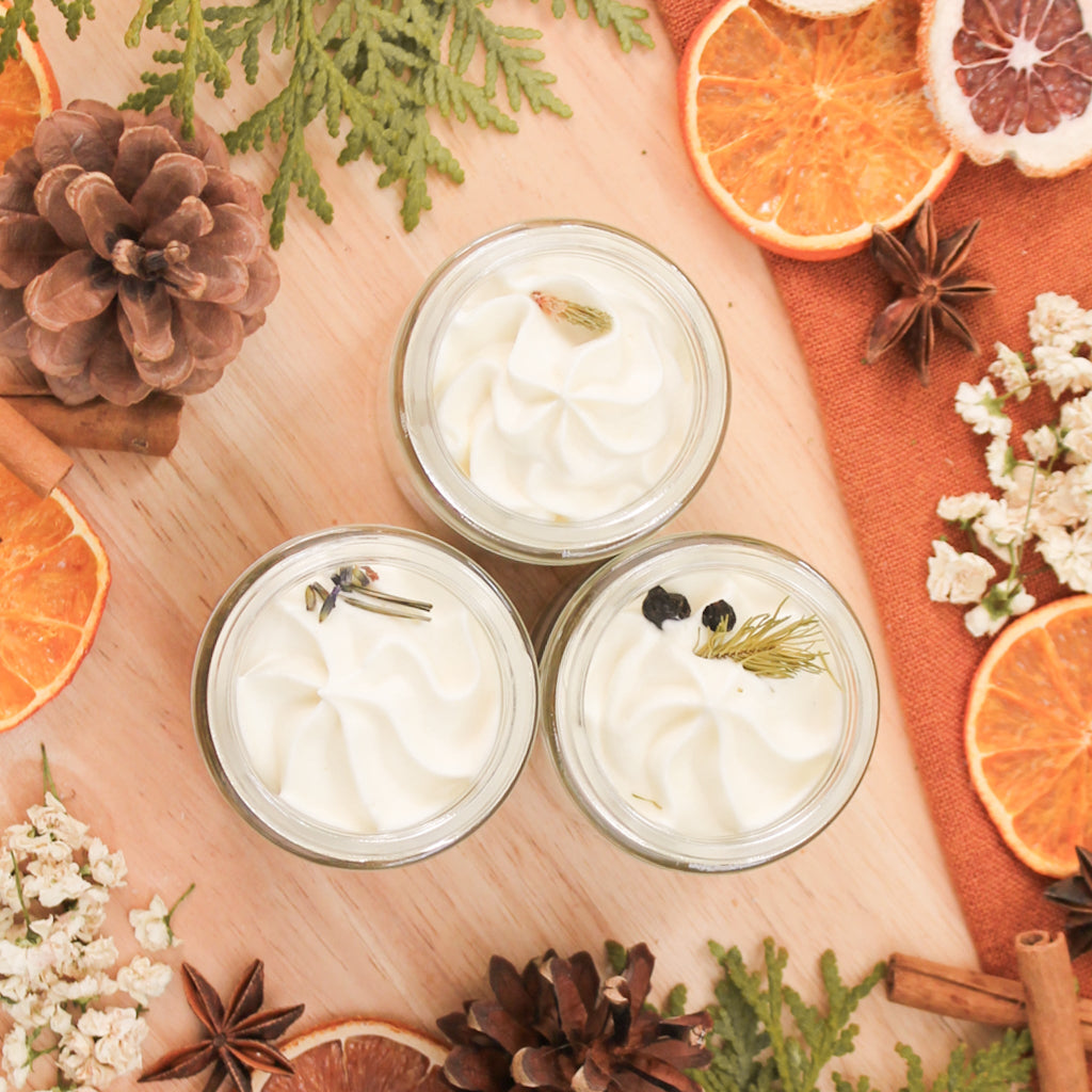 L'ensemble contient trois beurres fouettés corporels en petit format de 100 ml, parfaits pour la découverte de nouvelles odeurs.