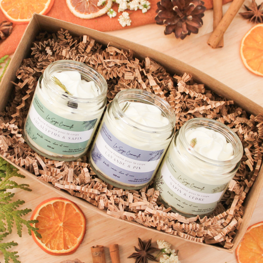 Surprenez une personne spéciale avec l'ensemble de trois petits beurres fouettés pour le corps faits avec soin avec des ingrédients richement hydratants. Vous pourrez choisir le trio saisonnier, classique, floral ou frais.